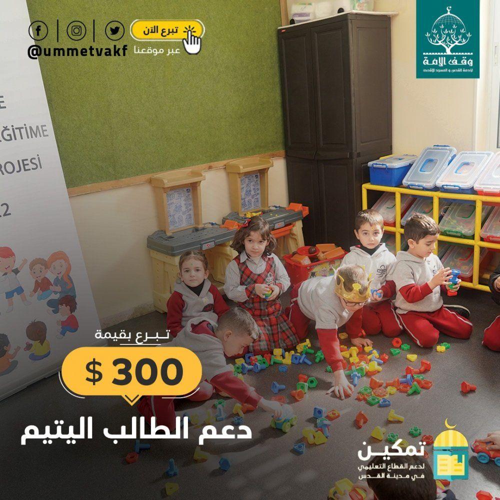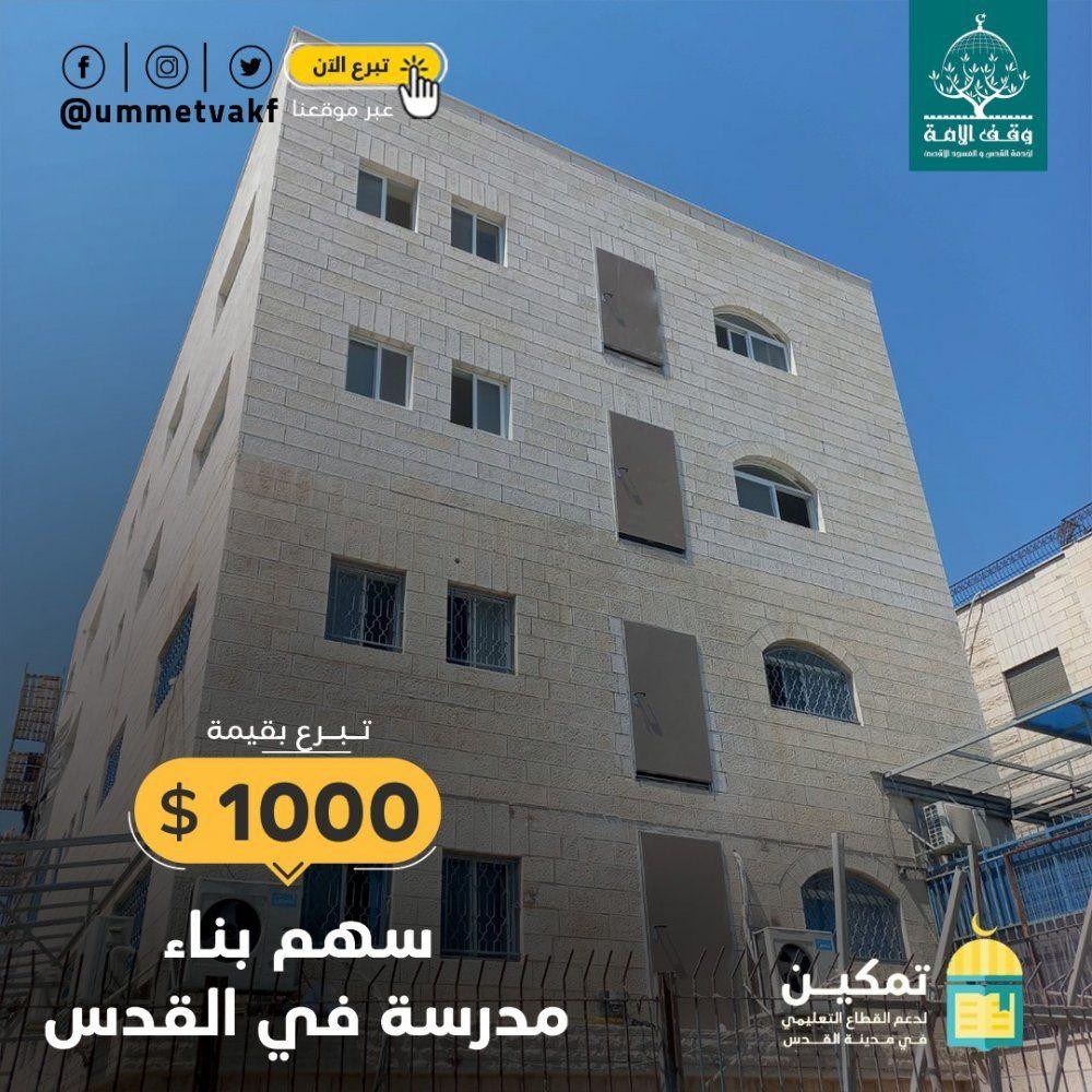 أمة كانت بدايتها ببضع أحرفٍ من كتاب الله "اقرأ" لا بد أن تضع نصب أعينها رعاية الطالب والاهتمام به، بل وترغيبه على طلب العلم، لعلو المكانة وعِظَم الأثر. يقول نبينا الكريم صلى الله عليه وسلم: "من سلك طريقاً يطلب فيه علماً سهل الله له به طريقاً إلى الجنة " رواه مسلم. ومن ضمن واجب رعاية الأمة لطالب العلم الاهتمام بالمدارس، ونقوم في هذا المشروع بافتتاح مدارس جديدة في مدينة القدس وذلك لزيادة اعداد الطلاب الدارسين في المدارس الفلسطينية حيت يتم شراء المباني الجاهزة وتحويلها الى مدارس بعد اعادة تأهيلها وتاثيتها. وبهذا تحدٍ لكل التضييقات على بناء مدارس عربية تحفظ الهوية الاسلامية والعربية لأطفال القدس.