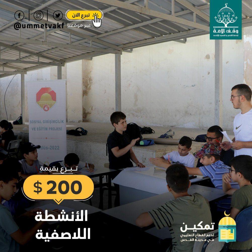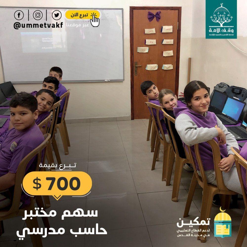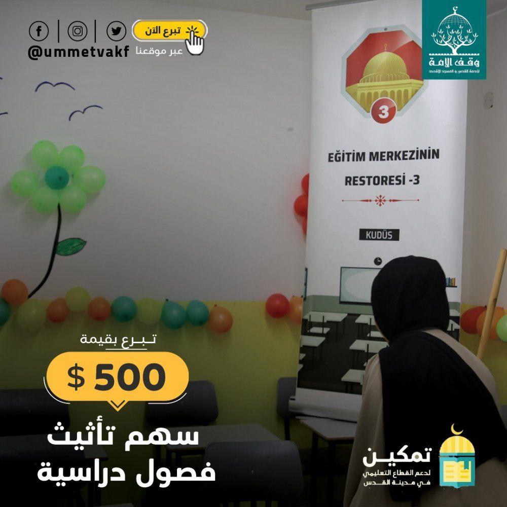 نطلاقا من حرصنا على أطفالنا وطلابنا الذين هم جيل المستقبل، كان واجبا علينا أن نركز اهتمامنا على هذه الشريحة من المجتمع المقدسي في تقديم كل مايلزمهم لمواكبة العملية التعليمية. حيث يتعمد الاحتلال تخريب المدارس والمرافق العلمية حتى يؤخر العملية التعليمية في مدينة القدس. يهدف المشروع إلى تأثيث 200 غرفة صفية في 10 مدارس في مدينة القدس. ويستفيد من المشروع 5 آلاف طالب مقدسي.