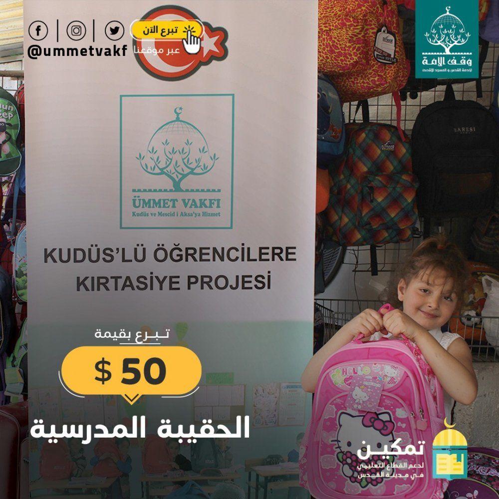 مشروع الحقيبة المدرسية مشروع نخدم به طلاب العلم من أهل القدس ونخفف الحمل عن الأسر المتعففة والأيتام، والذي يحرص الوقف على تنفيذه مع بداية كل عام دراسي. فالحقيبة المدرسية مع بساطتها إلا أنها تقف عائقاً أمام الكثير من الأهالي وتحرم أطفالهم من حقهم في التعليم. يهدف المشروع إلى توفير 1000 حقيبة مدرسية كاملة الأدوات والتي تحتوي على جميع أدوات القرطاسية، ويستفيد من المشروع أيضا تجار المدينة حيث يتم شراء الحقائب المدرسية منهم، وكل ذلك حرصا من الوقف على دعم وتثبيت أهلنا في المدينة المقدسة.