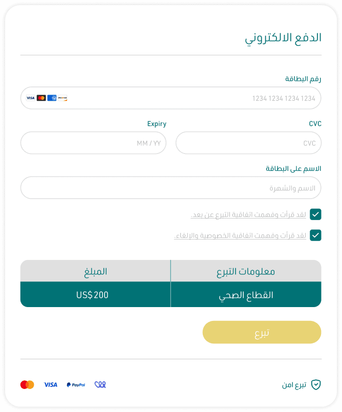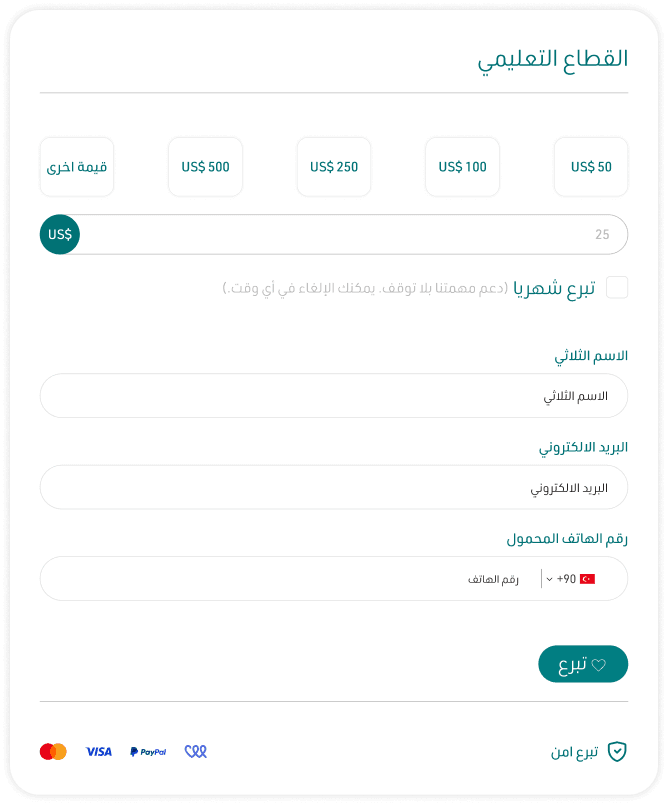 - املأ نموذج الاشتراك البسيط عبر نافذة التبرع الآمنة على موقع وقف الأمّة وأدخل البيانات الخاصة بك والمبلغ المراد اقتطاعه شهريًا والمشروع أو القطاع الذي تود تخصيص تبرعك لأجله.